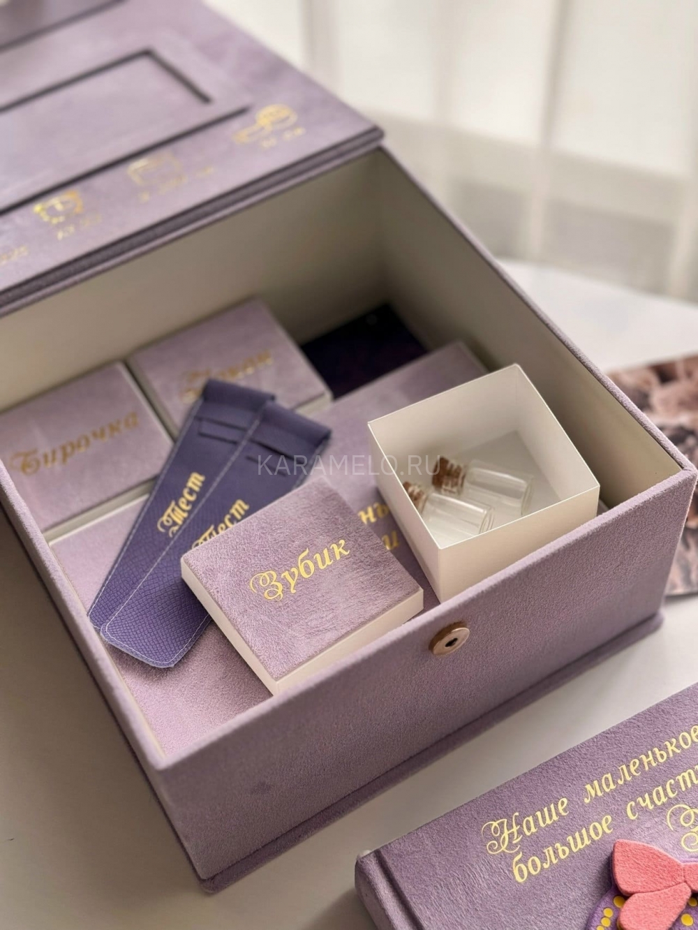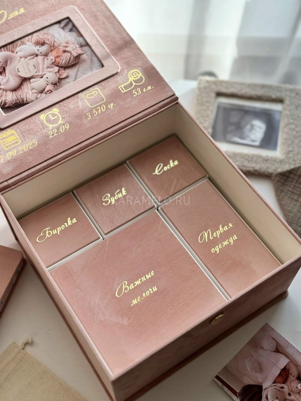 Все для хранения самых первых и самых трепетных воспоминаний. Состав: Баночка для зубика в коробочке. Коробочка для бирки. Коробочка для мелочей. Коробочка для локона. Коробочка для пупочка. Рамочка для фото. Конверт для УЗИ. Конверт для теста на беременность. Место для фотоальбома. Размер бокса 26х26×12 см. Наполнение можно сделать любым по Вашему желанию.